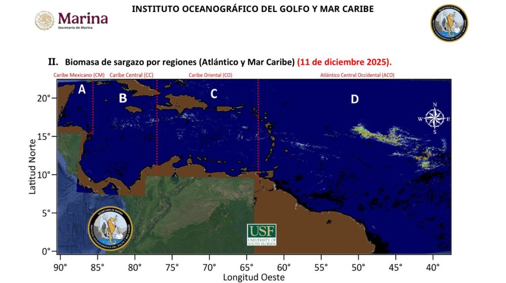 Confirmó que, derivado del monitoreo que se mantiene en altamar, actualmente existen condiciones climáticas para que continúe el arribo de sargazo al Caribe Mexicano.