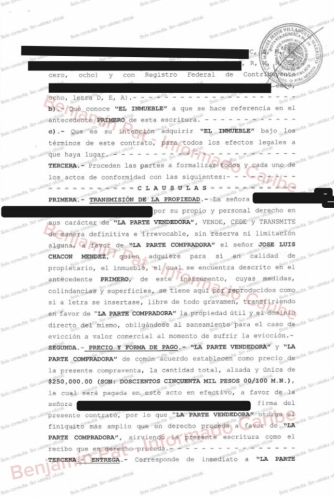 “La parte vendedora y la parte compradora, de común acuerdo, establecen como precio de la presente compraventa, la cantidad total, alzada y única de $250,000 pesos, la cual será pagada en este acto en efectivo… sirviendo la presente escritura como el recibo que en derecho proceda”, consigna la cláusula segunda de la escritura pública emitida por el notario de Cozumel.